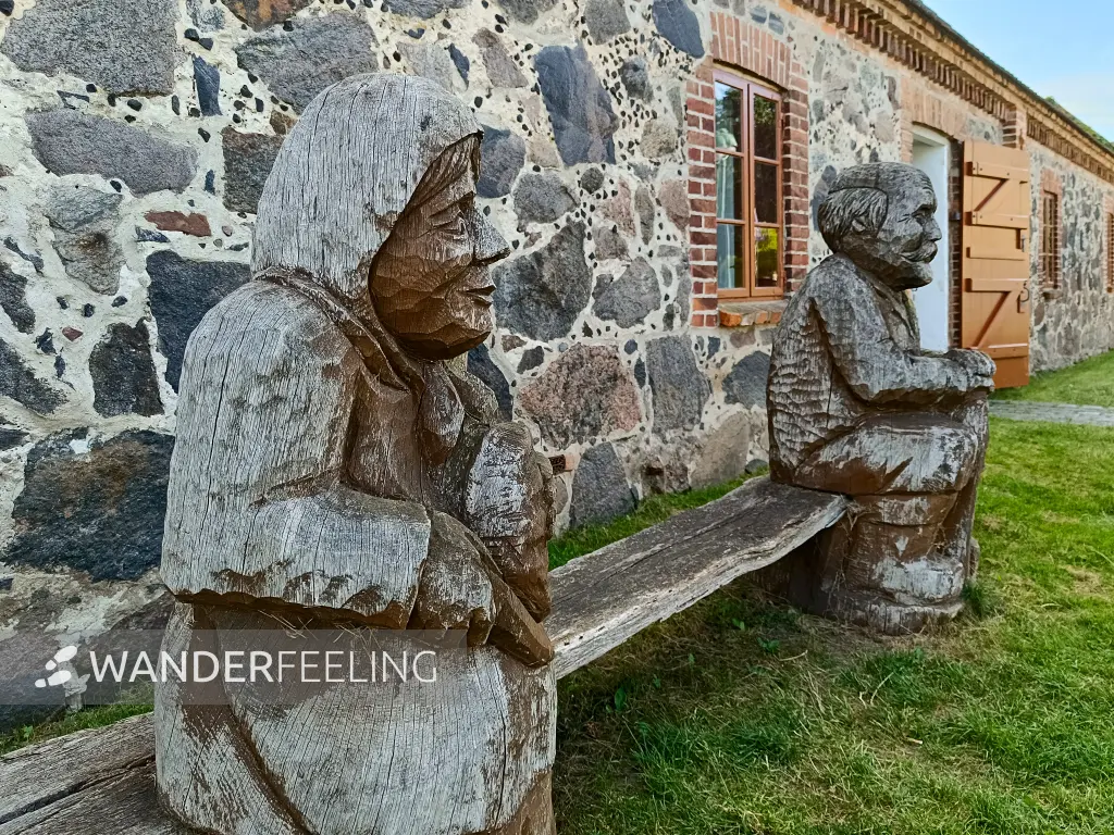 Holzfiguren vor dem Agrar-Museum Agroneum in Alt Schwerin, Mecklenburgische Seenplatte, Mecklenburg-Vorpommern, Deutschland